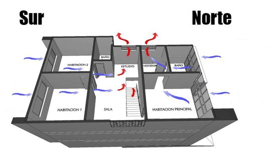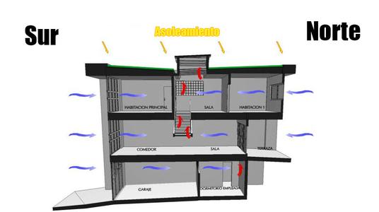 -Diseñando para que cada ambiente reciba iluminación natural reflejado (Cada ambiente con mucha iluminación significa que durante el día no se tienen que encender las luces, y si es luz reflejada en vez de directa, no va a calentar los ambientes).