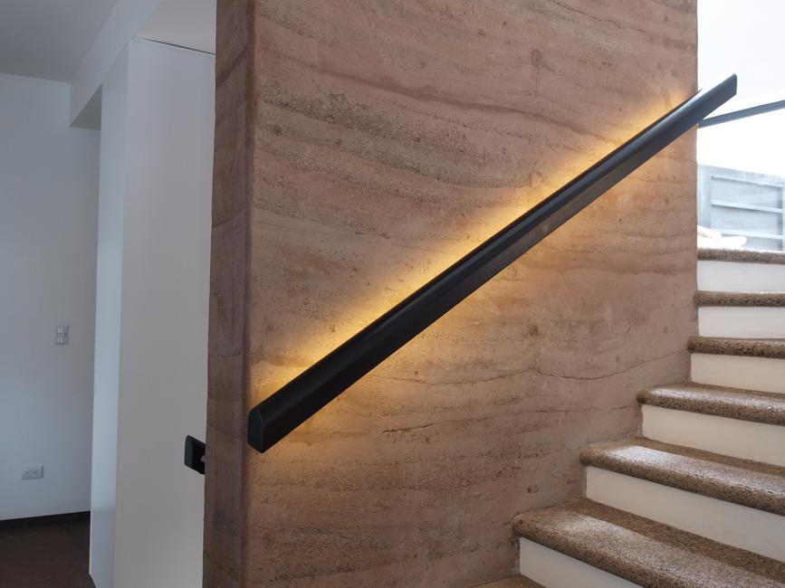 Gradas de una residencia, iluminación de la textura de la pared de tierra apisonada (rammed earth wall)