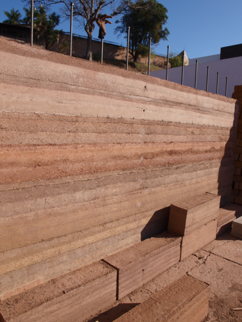 Para hacer estas paredes ecológicas, el material del sitio es utilizado para compactarlo y es estabilizado con cemento. Llevan refuerzo metálico por dentro, y un proceso de estudio para sacar las proporciones adecuadas.