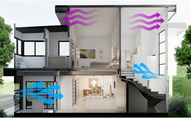 El diseño considera el flujo de aire para refescar la vivienda. A traves de una salida de aire caliente en la parte alta de las gradas, y permitiendo una entrada de aire fresco por bajo, que, con el arbol frontal, ayuda a enfriar pasivamente la vivienda.